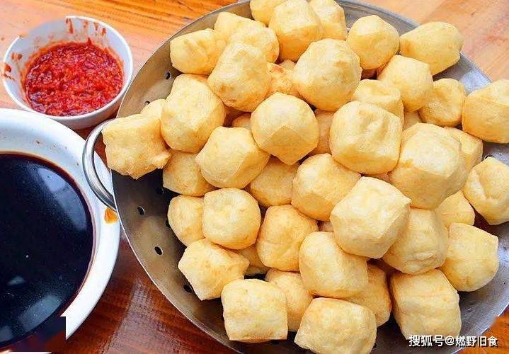 泡豆腐是把豆腐切成薄片下油锅炸至金黄色,起锅后热腾腾的油豆腐,配上当地的辣椒酱和酱油,非常香!
