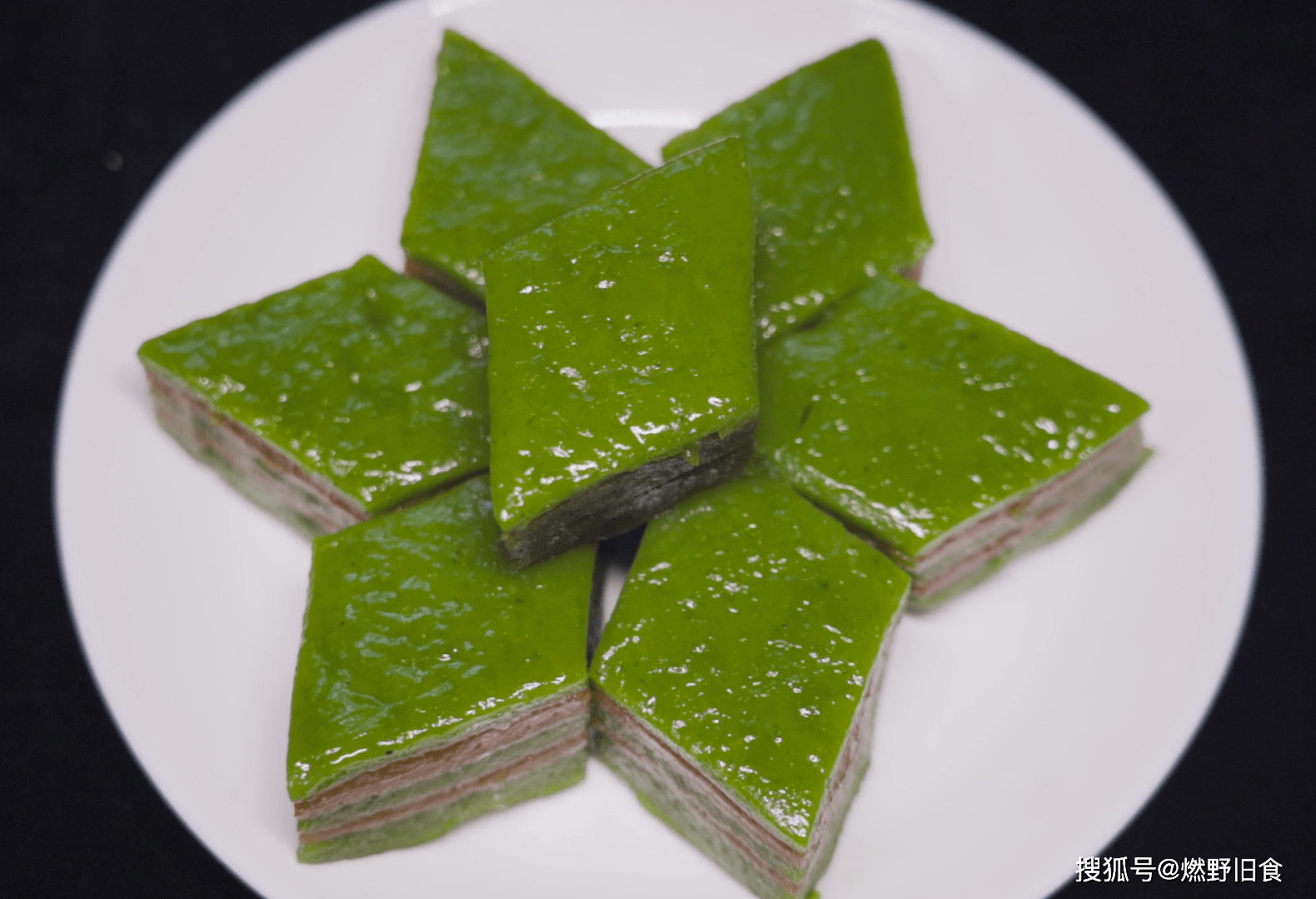 做成的千层糕颜色由碧绿与橙红,除了浓郁的大米香气外,还带有丝瓜的香气,口感软糯Q弹,是离开遂昌之后很难吃到的家乡味。