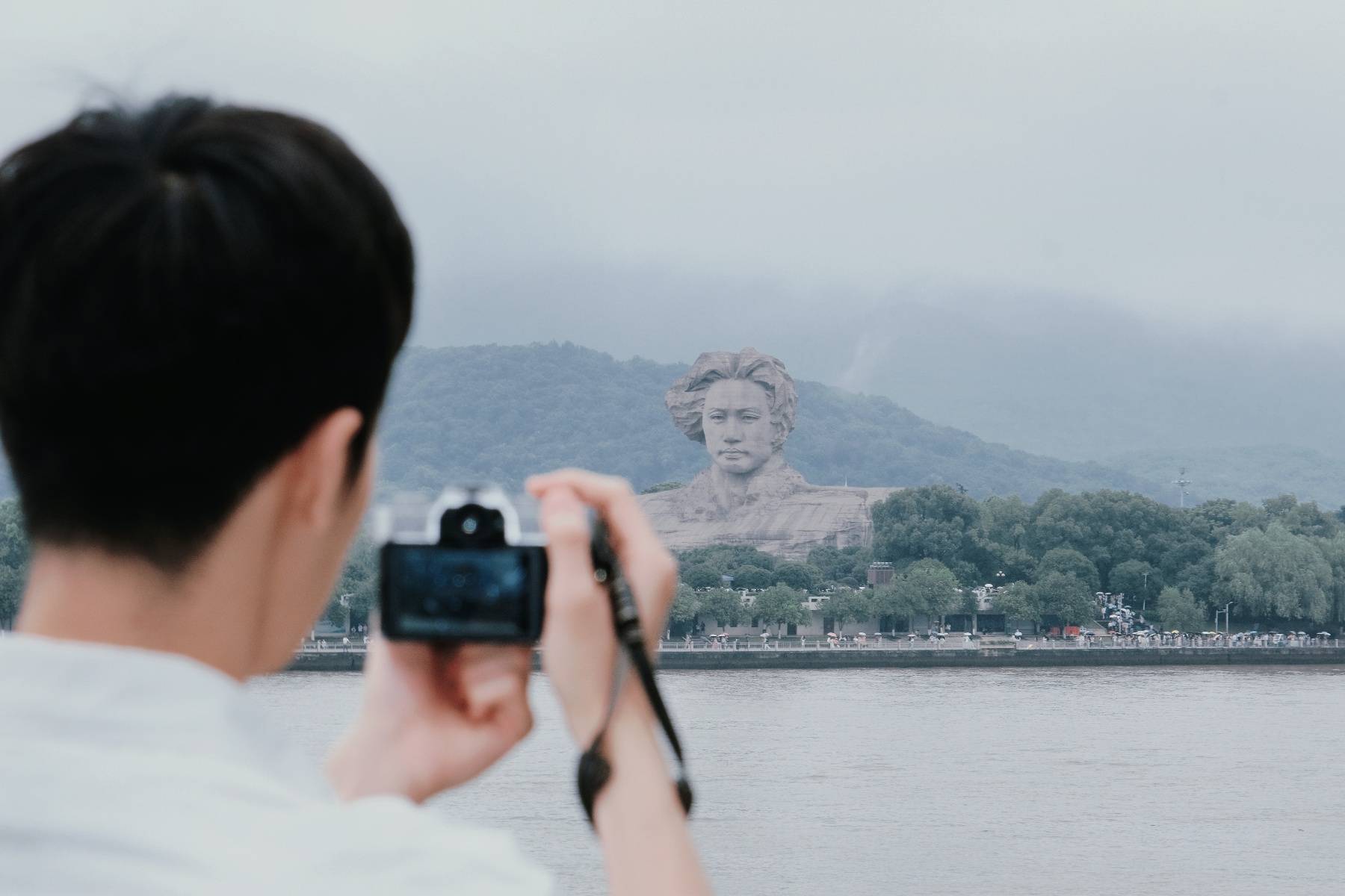 游客在江边拍摄毛主席雕像