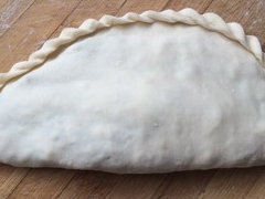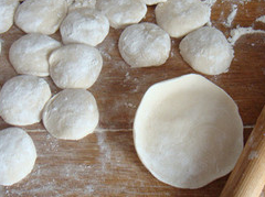 取一个剂子,擀成中间厚四周薄的面片,放馅料,可以包成如图的花边样;