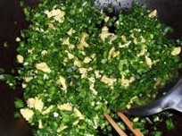 调制馅心:择好的韭菜清洗干净,控干水份切碎,放盆内,这一步也可以在和面之前做;鸡蛋加少许盐打散,油热后倒入鸡蛋液,边炒边用铲子搅碎,或者炒好后切碎放入盆里;