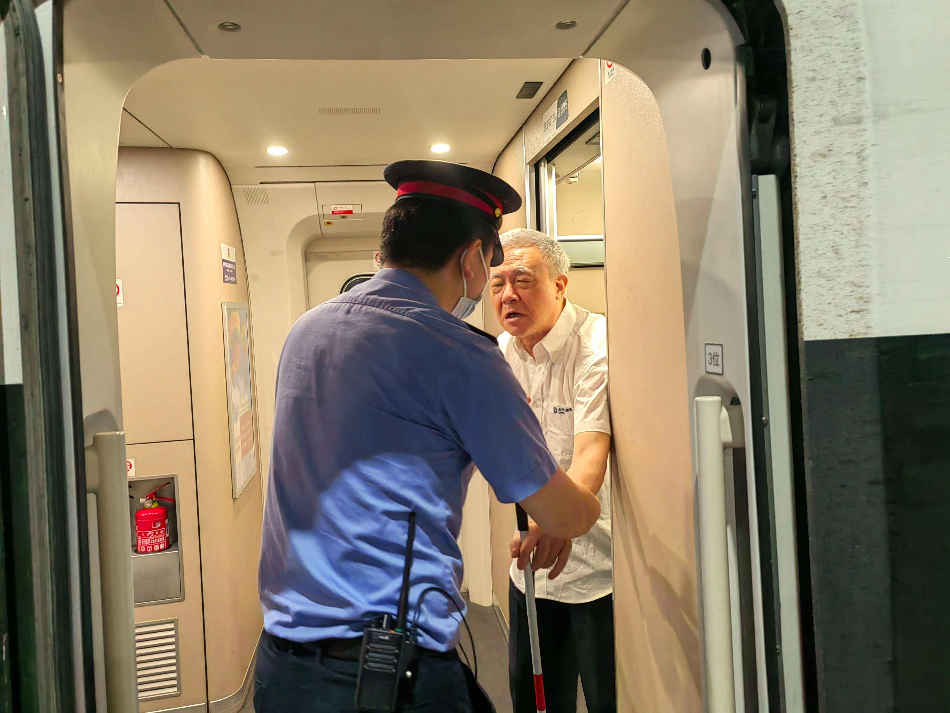 列车员党志诚帮助两位重点旅客下车,由车站志愿者护送出站
