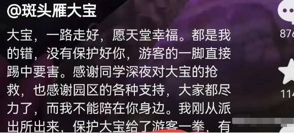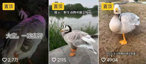 近日,“景区网红大雁被游客踢中要害不幸离世,生前为宣传景区做出巨大贡献”的新闻,在网上疯狂传播。账号ID为“斑头雁大宝”的短视频账号,一连发出数条视频,悼念被游客一脚踢死的大雁,通函自己没有保护好它。