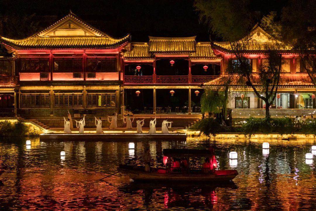 在牛市汪,夜幕降临,光影四起,舞蹈演员们在灯光与音乐的伴随下,一把油纸伞,一袭仙衣裙,婀娜多姿,翩翩起舞,似一场与梦的邂逅、与运河的相识。