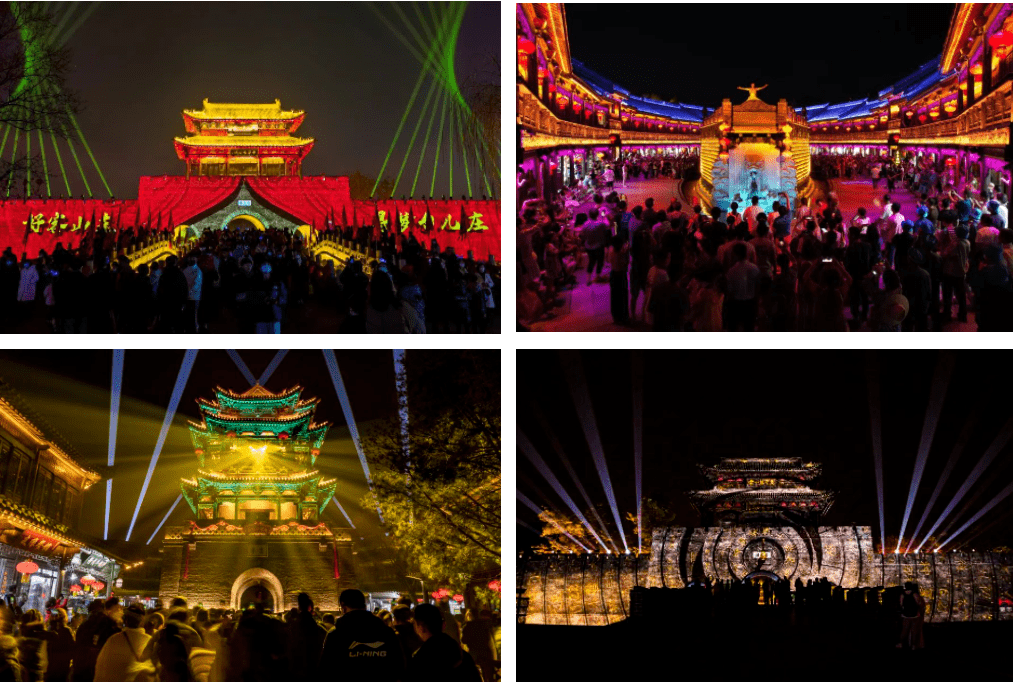 台儿庄古城光影秀一直以来,都是游客必打卡的景点。古城东门的迎宾秀、西门的投影秀、市楼的灯光秀、船形街的光影秀……每一处都讲述着不同的故事,每一处都充满科技感和穿越感。