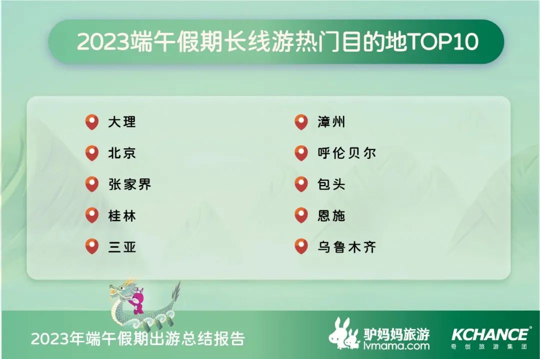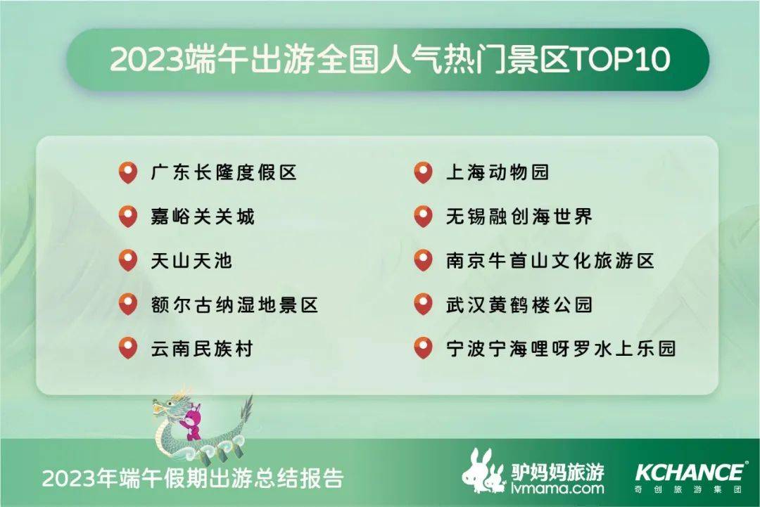 《报告》表示,广东长隆度假区、嘉峪关关城、天山天池、额尔古纳湿地景区、云南民族村、上海动物园、无锡融创海世界、南京牛首山文化旅游区、武汉黄鹤楼公园、宁波宁海哩呀罗水上乐园成为国内最受欢迎的十大景区。相较刚过去的五一,端午期间由于全国大部分地区气温升高,水上乐园和避暑类景区更受游客欢迎。无锡融创海世界、宁海哩呀罗水上乐园、北京水立方嬉水乐园、清远古龙峡漂流国际漂流赛场、广州长隆水上乐园、金华檀宫泡泡水上乐园等人气大增。