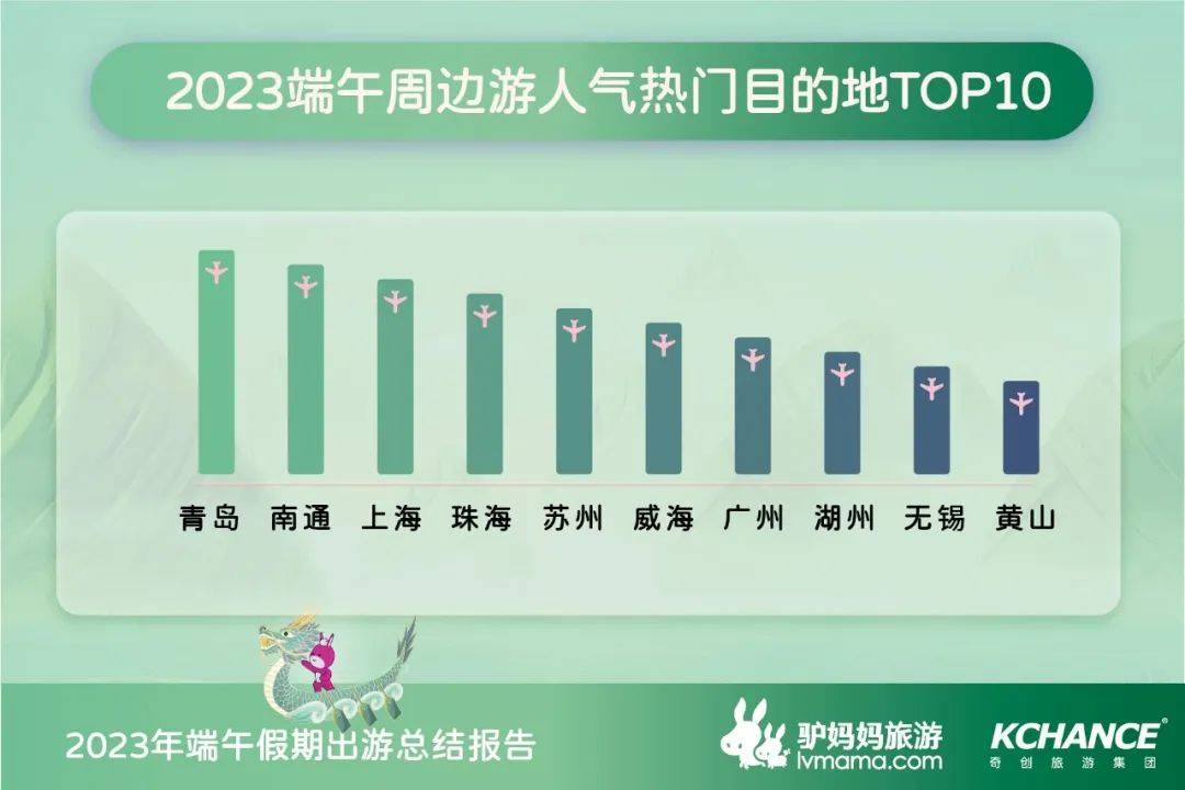 《报告》显示,今年端午假期以中短途为主,行程短、交通方便的周边游预订火爆,亲子游仍是周边游的“主角”,3小时自驾圈、2小时高铁圈成为家长们的不二之选。青岛、南通、上海、珠海、苏州、威海、广州、湖州、无锡、黄山成为十大周边游热门目的地。