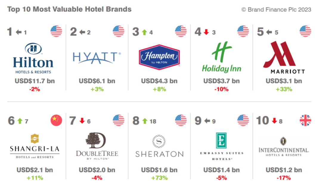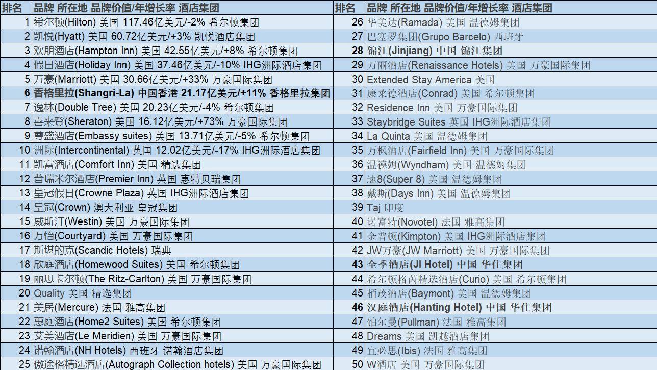 逸林(Double Tree)、尊盛酒店跻身前十,分别排在第七、九位。除此之外,旗下的欣庭酒店(18)、惠庭酒店(22)、康莱德酒店(31)、希尔顿格芮精选酒店(44)也都榜上有名,共计8个品牌上榜。