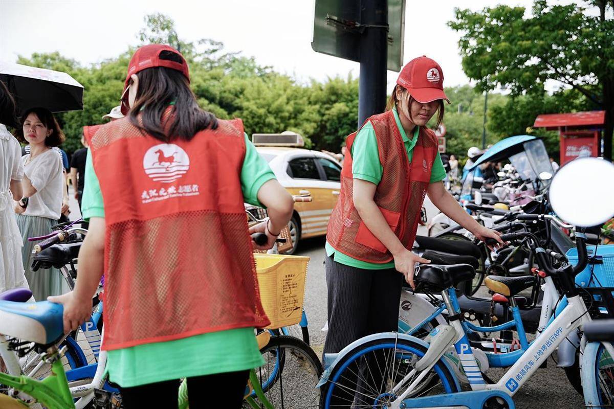 东湖景色宜人,很多年轻游客偏好骑单车游玩,景区门口有不少随意摆放的单车。武汉文旅志愿者立马上前整理摆放单车,疏通道路,引来了游客的关注和效仿。“首先我们要以身作则,主动践行文明出游的理念,通过我们的行为让更多人意识到文明出游的重要性,只有方便了他人,才能更好地方便自己。”文旅志愿者谢辉阳说道。