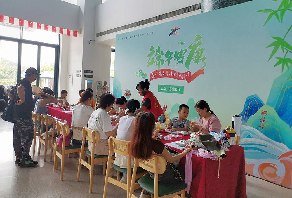 为了提升游客的游玩体验,景区在游客中心大堂推出了香囊DIY活动,一针一线缝香囊,互相送出美好的祝福,共同传承传统文化。