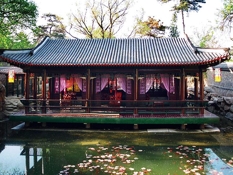 烟雨楼,位于山庄的西南面,是仿照浙江嘉兴南湖烟雨楼建造的一座宫殿式建筑。整个园中园以建筑统摄全局,庭院各立面性格各异,西、南立面有假山、古木、院墙的掩映,颇有些内敛朦胧之意;而东、北立面则让建筑立面直抵水面,气魄非凡。