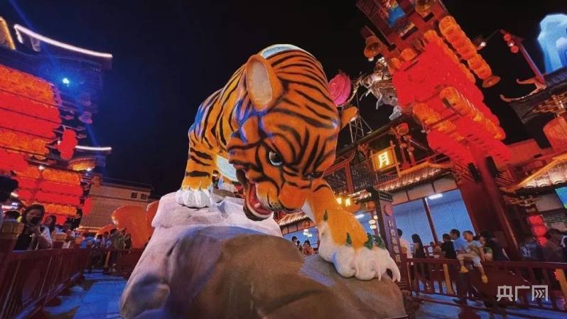 游客孙小倩带着老人和孩子在老虎造型前拍照打卡,她说:“大型仿古建筑在火红的灯光映衬下,恢宏大气,我们还品尝到了很多特色美食。”