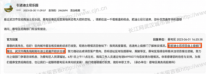 6月1日,武汉市蔡甸区商务局在“武汉城市留言板”上正面回应了市民对“蔡甸区是否有接洽迪士尼招商项目”的关切!