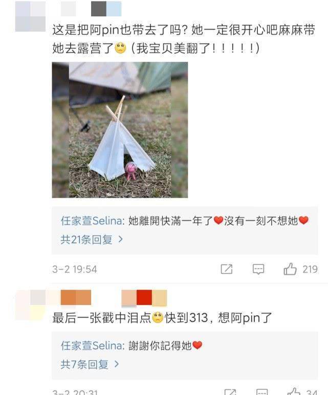 在任家萱配的最后一张照片中,是一只粉丝的小狗,粉丝看到之后就想到了任家萱心爱的狗狗。而就在去年11月的时候任家萱心爱的宠物永远的离开了她,这次露营任家萱也带自己的阿pin去了露营现场,和她一起分享快乐。面对粉丝的感动,任家萱Selina也说很感谢有人记得自己最心爱的宠物。