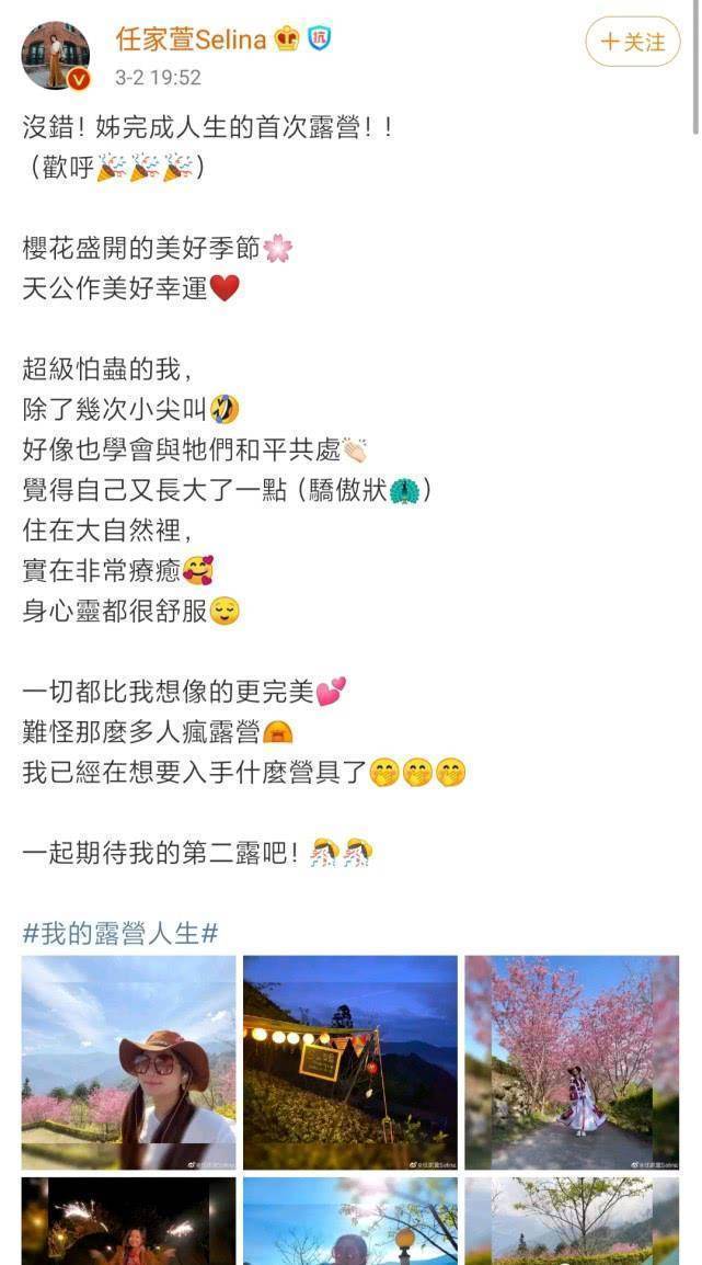 虽然此次的露营让Selina任家萱心情非常的不错,而且学会了不少新的技能,甚至如她所说能够和自己害怕的虫子和谐共处,Selina也让大家期待自己的第二次露营。但是没想到在任家萱首次露营结束晒美照,而最后的一张配图却让粉丝们感动。