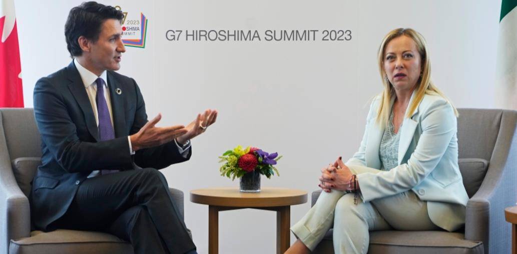 加拿大领导人特鲁多从国外直接飞抵广岛出席G7,意大利领导人梅洛尼也抵达。他们仍然坐在一起,热切地闲聊。看来这话并不是投机的,女主角有些不高兴!