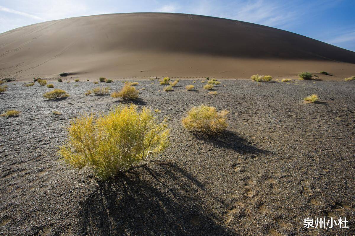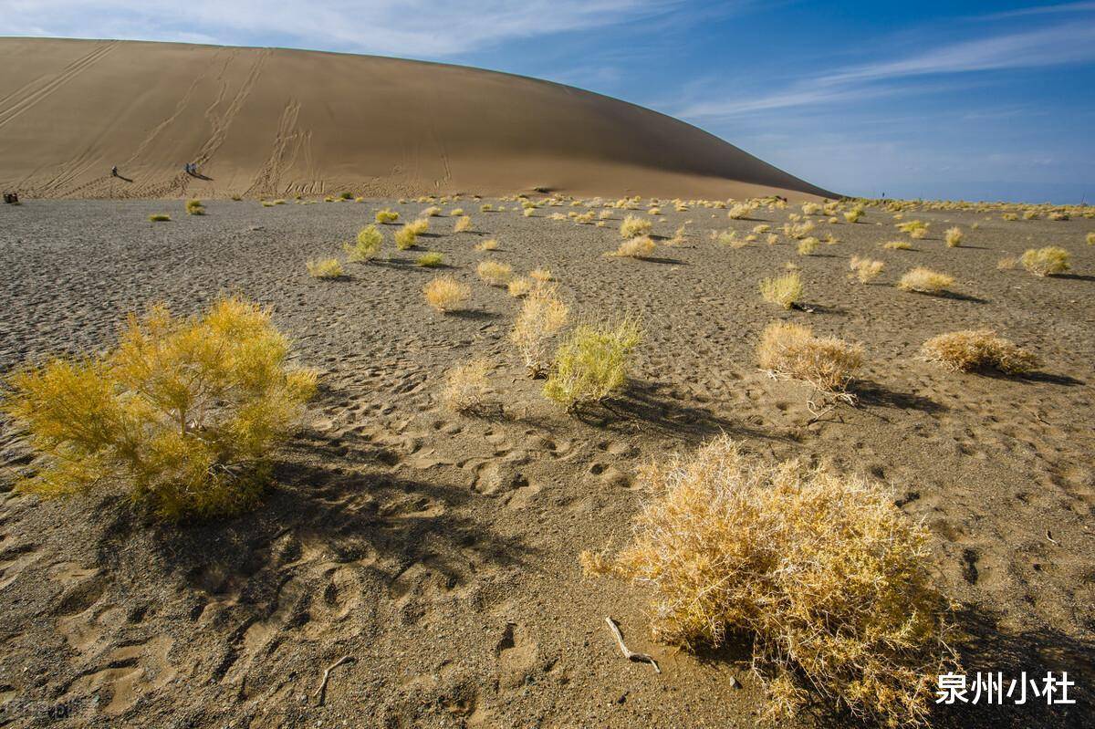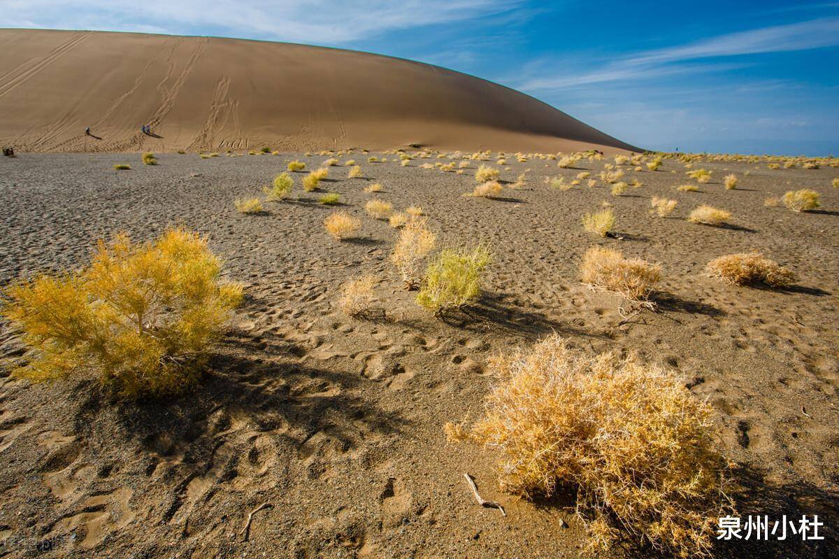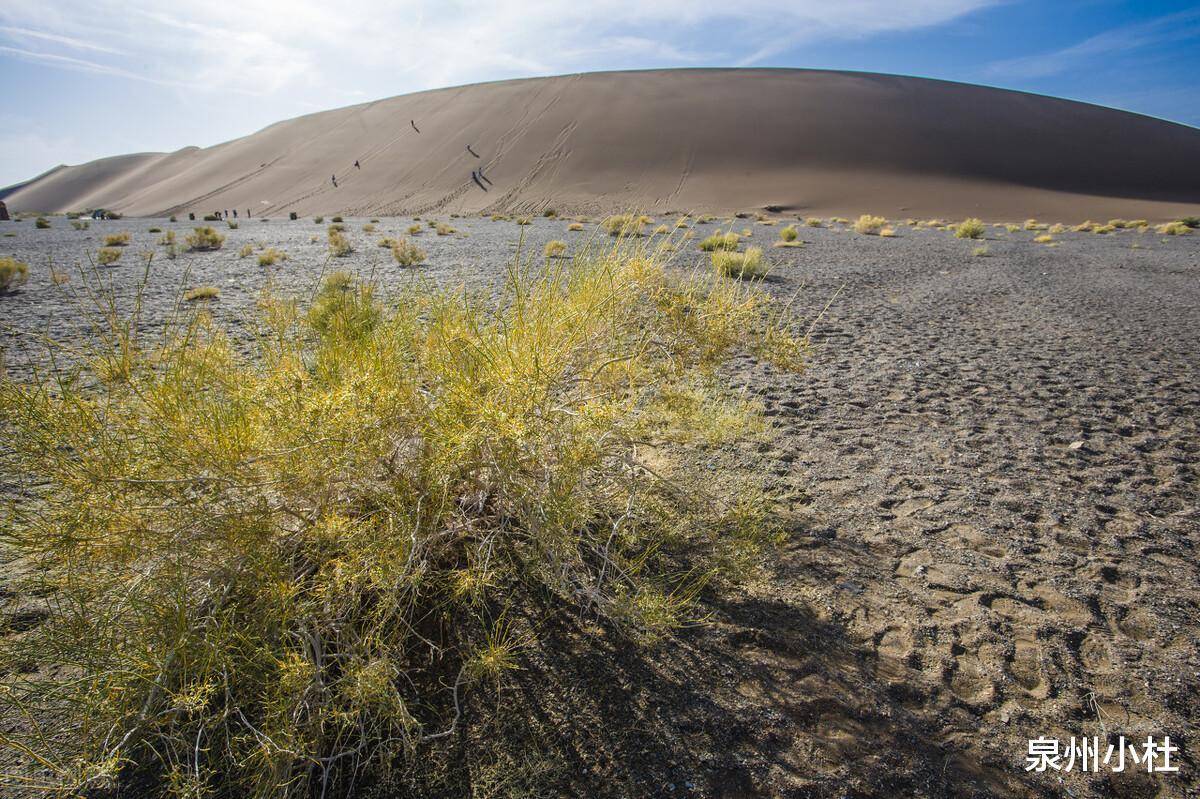 鸣沙山还有一个有趣的现象。这里的流沙不是往下流,而是往山上滚。这可能是因为沙山脚下刮大风,挡住了路,所以只能吹过沙山。于是,流沙颗粒滚滚滚滚,形成了奇妙的景观。