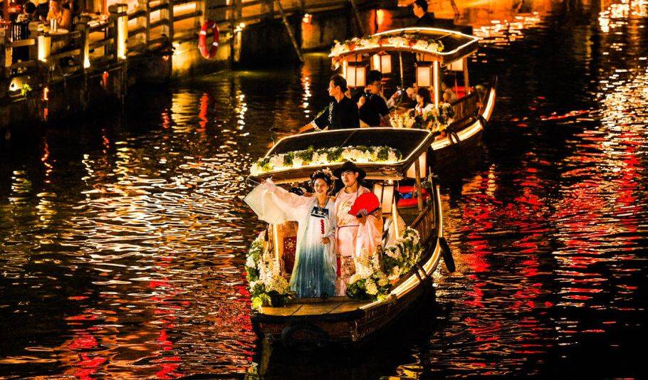 小桥流水,花舟悠然,游客们惬意地坐在被鲜花装饰的乌篷船上,乘着朦胧的月色,伴着清风徐徐和筝声悠悠,依水而筑的商铺和生活琐事都被缓缓抛诸脑后。阳光下的古镇有一种古朴的美,而夜幕中的古镇则散发出一股柔和甜美的气息,让人不自觉地慢下来静静品味。