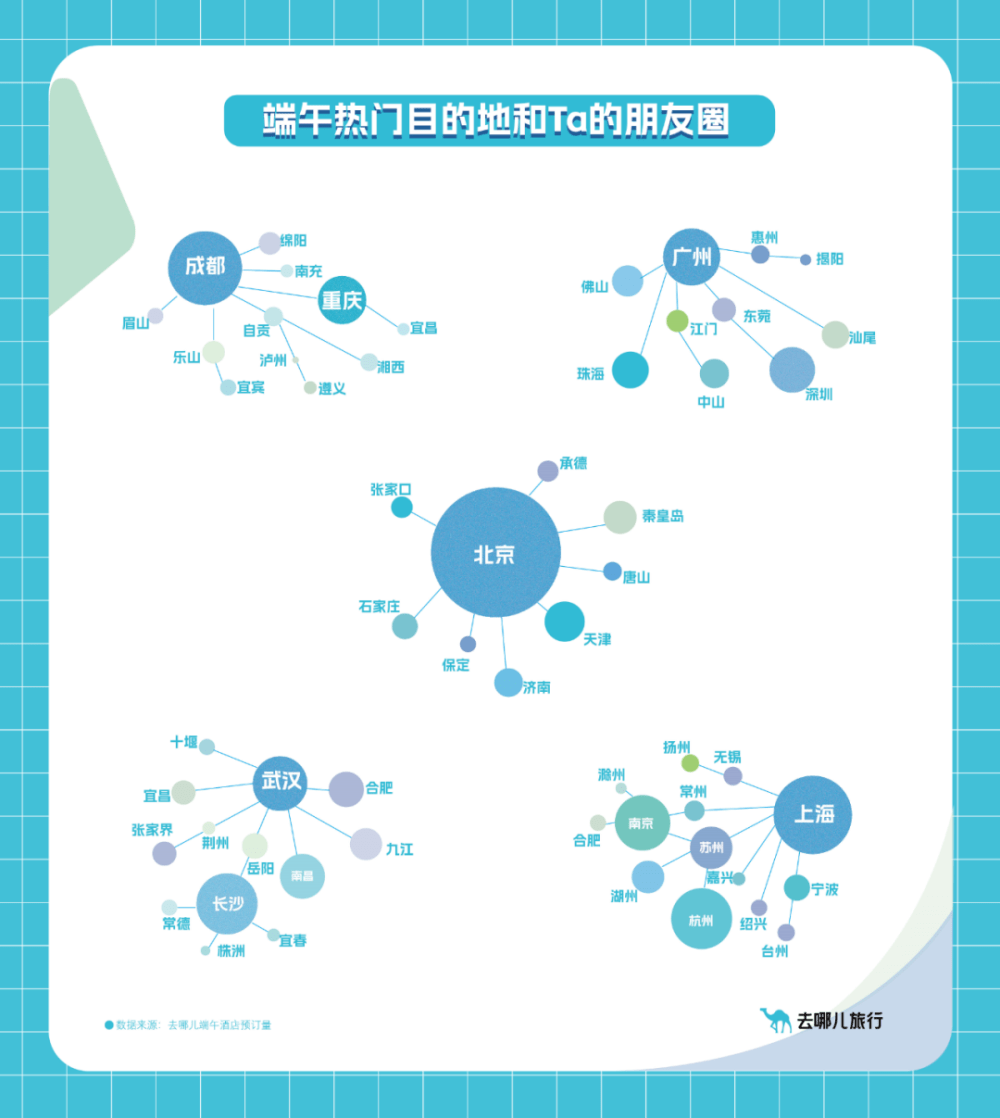 受假期时长影响,高铁游、自驾游、周边游等是小长假中最受欢迎的旅行模式。从火车票预订情况来看,从大城市出发,乘坐高铁2小时可抵达的城市更受游客青睐。例如北京周边的天津、秦皇岛、济南;上海-杭州-南京周边的湖州、宁波、嘉兴、无锡;广州-深圳周边的汕头、惠州;武汉-长沙周边的南昌、九江、荆州、岳阳;成都-重庆周边的乐山、遵义等。
