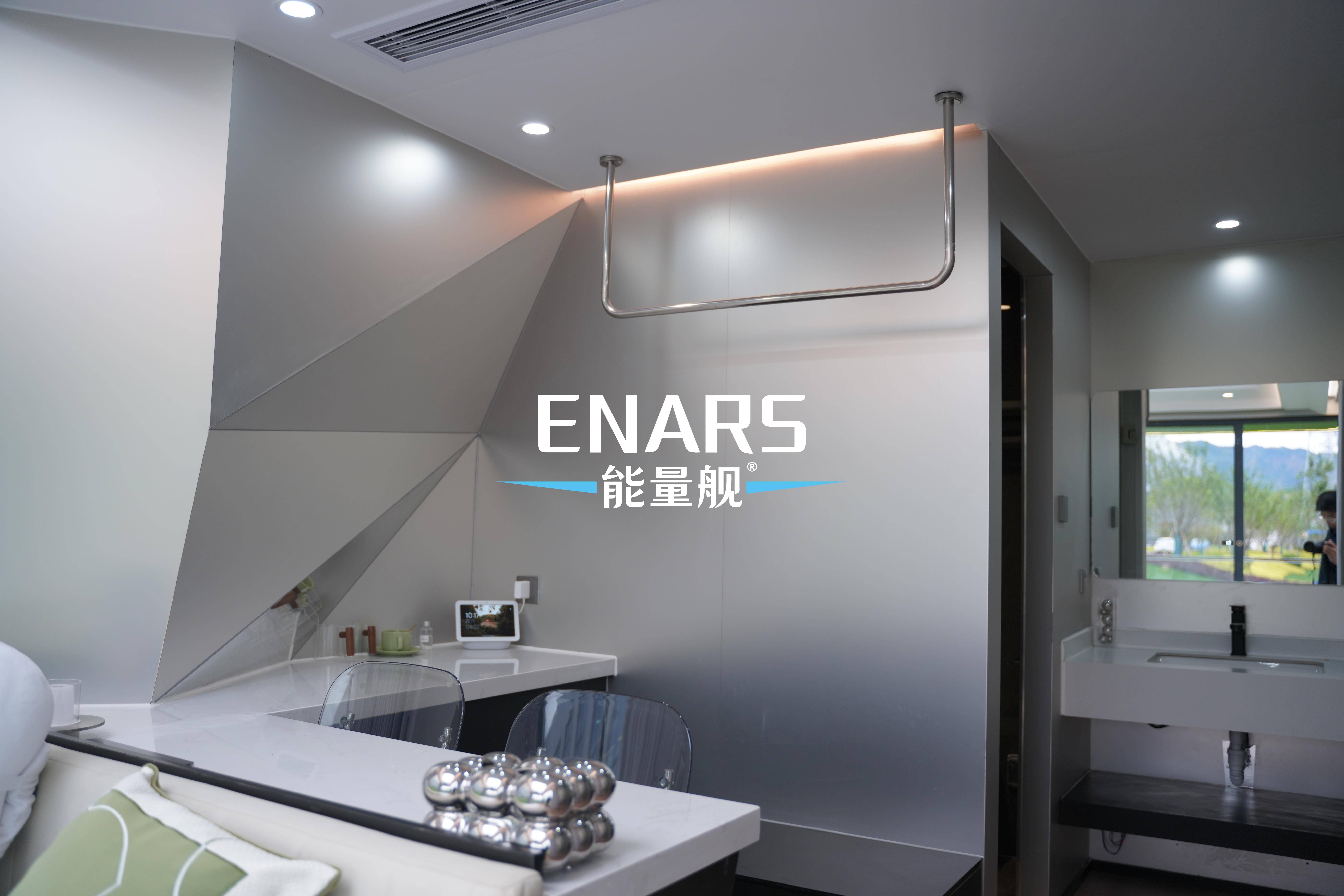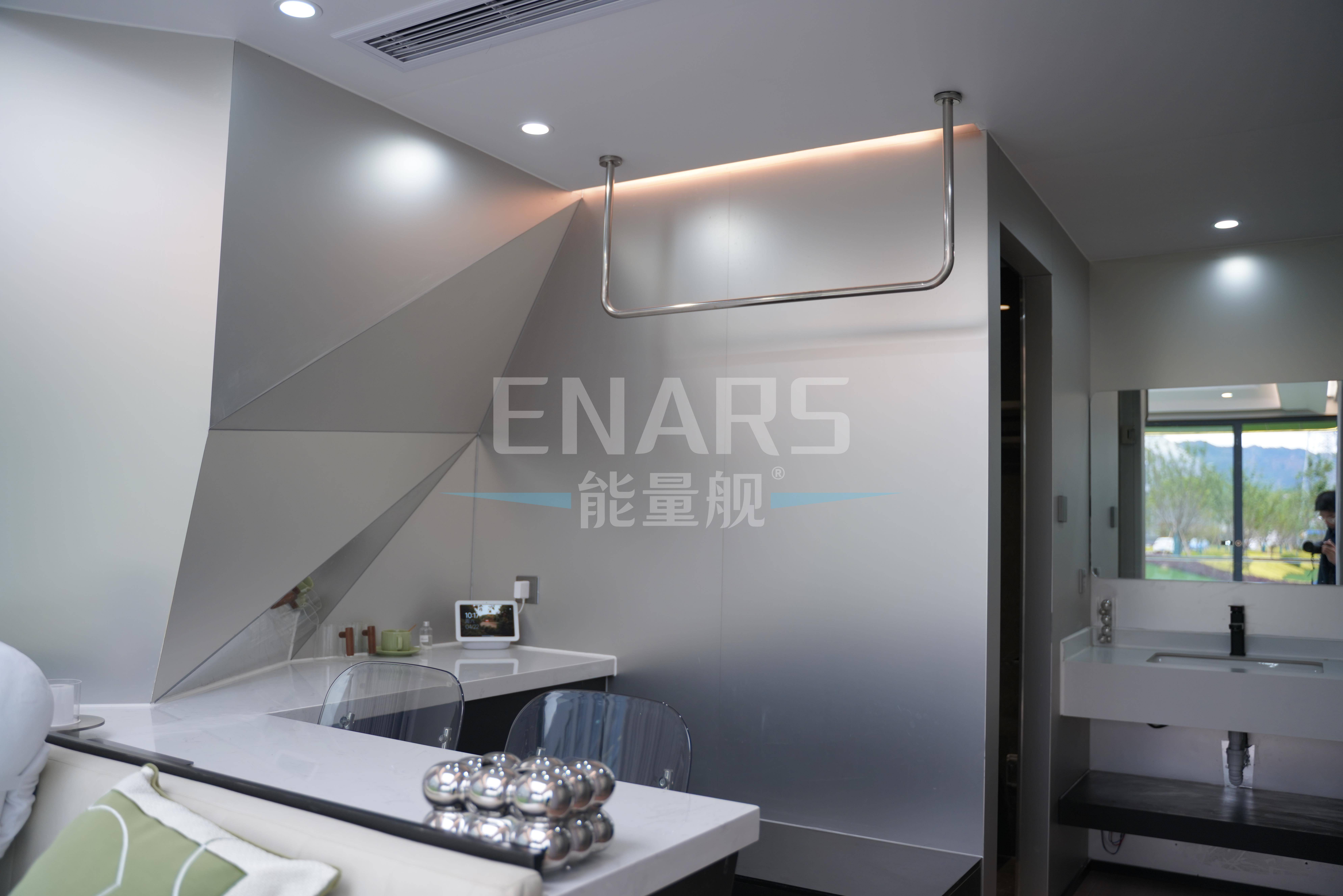 能量舰EV10作为太空舱民宿,外部造型大气简约,内部设计极富人文关怀,银灰配色间,点缀了文旅营地之景色。