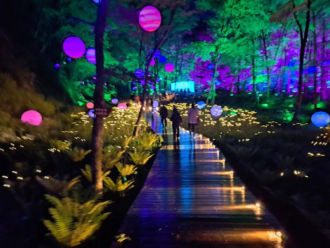 夜幕降临,开启梦幻之旅。寻路霓虹、鹿门月照、时心何足、独立鳌头、刘海戏蟾、晓雾星河、星垂平野、水蛟山魅八大场景色彩绚丽,管仲桥、伯乐桥、愚公桥、子牙桥、相如桥、阳明桥六座桥梁与溪水相映成辉。极具震感的水幕电影、绚丽的无人机表演、特色花船演出、烟花秀等节目将在这里轮番上演。欣赏完美景,可以到帐篷营地宿营,既能逃脱繁华又能接触自然。总之,在这里游客可以尽情享受温度、湿度、美景绝佳的沉浸式清凉体验。