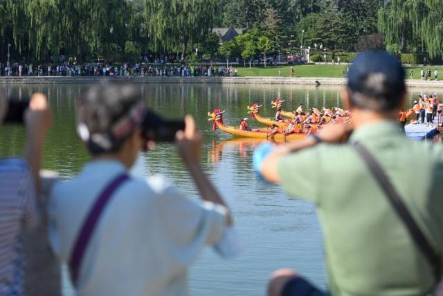 6月22日,游客在北京龙潭湖公园观看龙舟比赛。新华社记者 鞠焕宗 摄