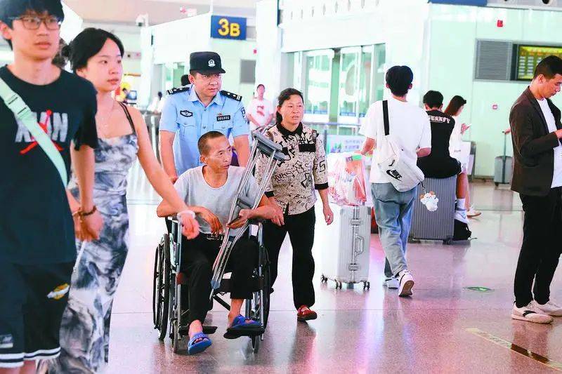 6月22日,民警在西安北站帮助行动不便的旅客。当日,西安铁路迎来端午假期客流高峰,西安铁路警方增加警力,并对有急难问题的旅客进行及时有效的帮助,确保旅客出行平安有序。(西安报业全媒体记者 雷伟东 通讯员 张鑫 赵冬杰 摄)