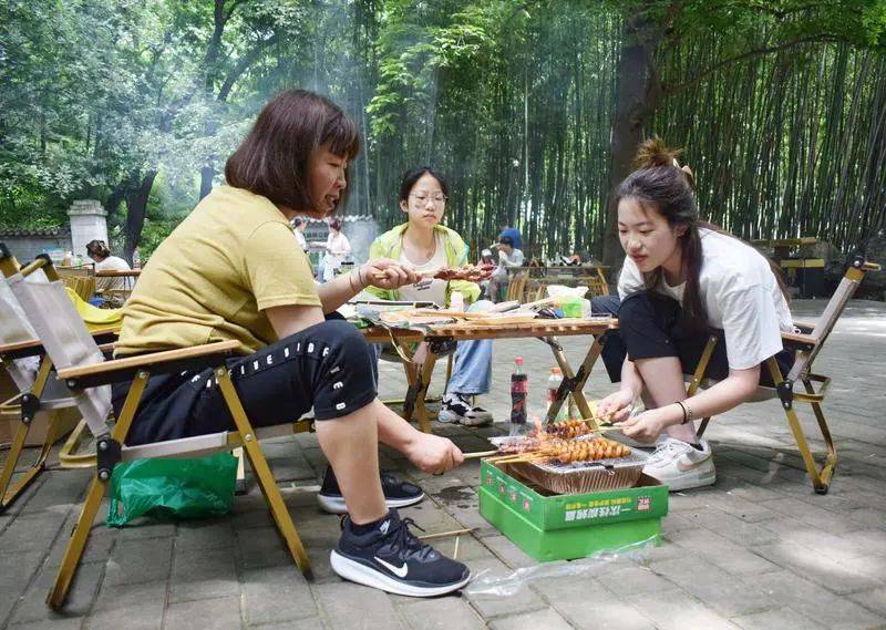 端午假期,游客在西安楼观生态文化旅游景区内不仅可以避暑纳凉看美景,还可以收获帐篷露营、自助烧烤和火锅等户外一站式度假体验。(通讯员 陈丽华 摄)