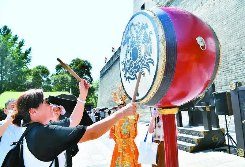 6月22日,游客在西安城墙景区击鼓。当日,西安城墙景区举办“趣玩端午 乐享城垣”2023端午主题系列活动,通过“聚福粽”互动祈福、盛唐天团对诗互动、大唐运动会等趣味横生的游乐项目,让市民游客尽享端午假期的欢乐。(西安报业全媒体首席记者 李明 摄)