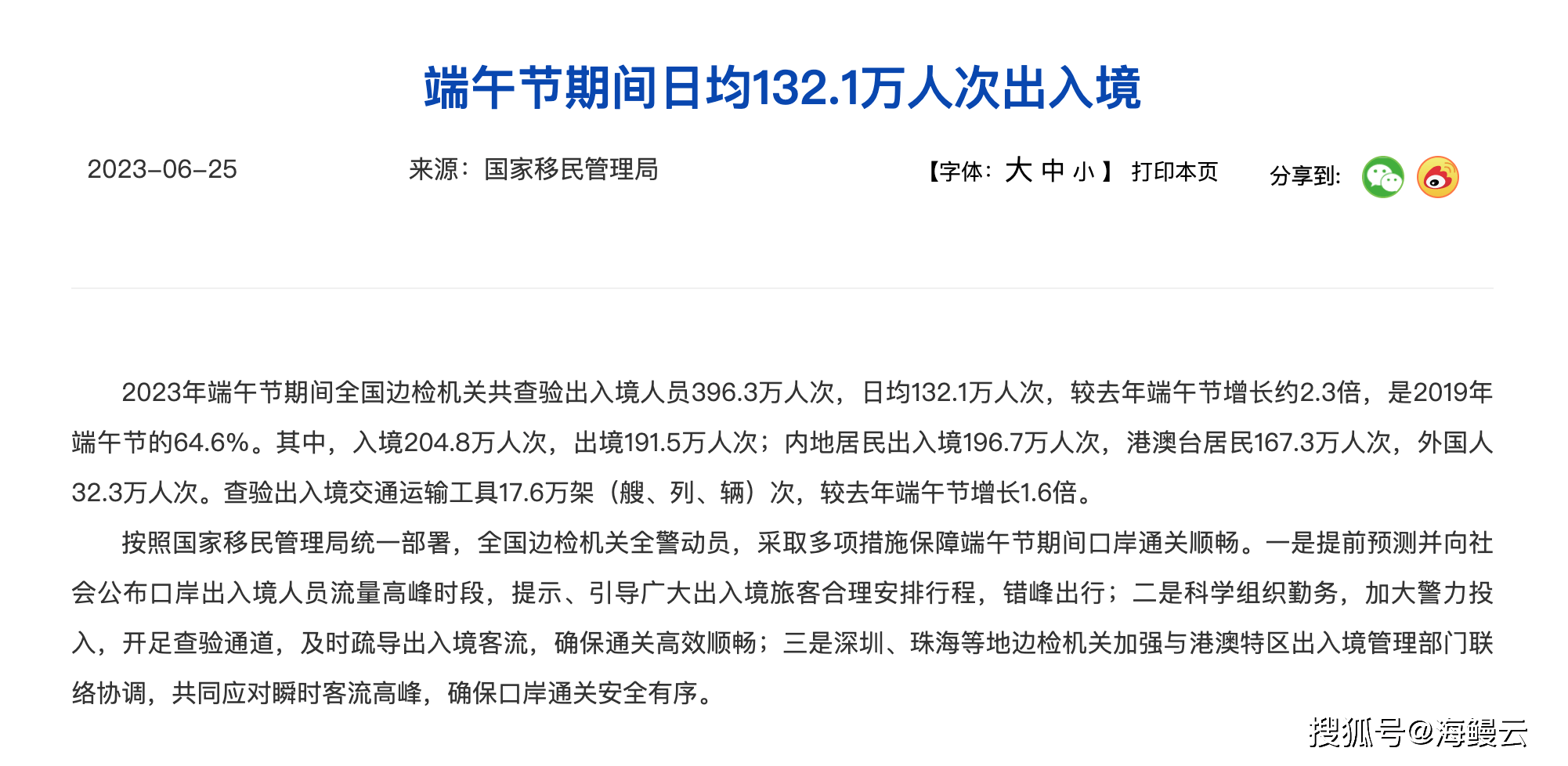 端午假期,入出境旅游市场迎来了小高潮。据国家移民局的数据,端午节假期三天,入出境人数恢复到了2019年的六成以上。2023年端午节期间全国边检机关共查验出入境人员396.3万人次,日均132.1万人次,较去年端午节增长约2.3倍,是2019年端午节的64.6%。其中,入境204.8万人次,出境191.5万人次;内地居民出入境196.7万人次,港澳台居民167.3万人次,外国人32.3万人次。查验出入境交通运输工具17.6万架(艘、列、辆)次,较去年端午节增长1.6倍。受港澳基础市场和东南亚、日韩等周边国家旅游推广和促进政策影响,加上民航、邮轮、酒店、餐饮大交通和目的地资源商等供应链的稳步恢复,以及签证和口岸通关政策的便利化,端午节假期入出境旅游达到了2020年以来的峰值,西亚、北非和欧洲等中远程市场也迎来新年以来小高潮。