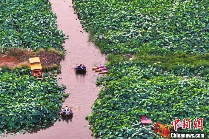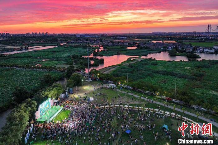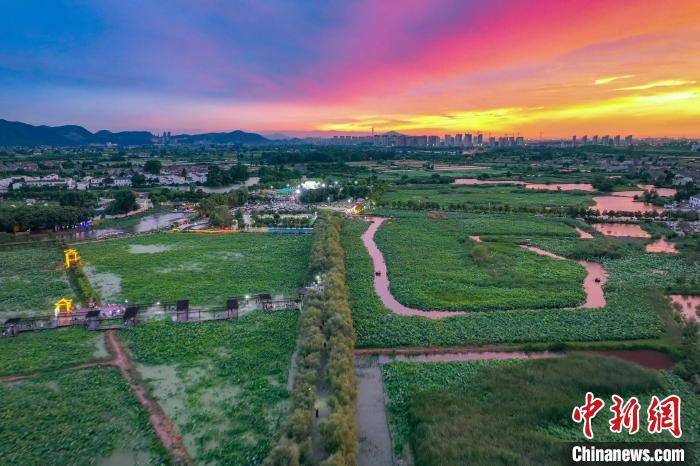 23日,航拍位于南京栖霞区龙潭在水一方景区的荷花基地,在绚丽晚霞的映衬下,这里“千层翠盖万红妆”。 泱波 摄