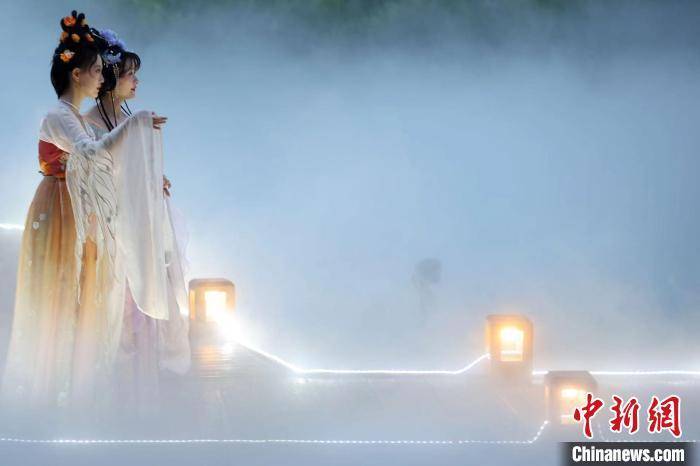 近日,南京高淳水慢城荷花塘上演音乐剧《荷塘夜色》,身着古装的游客在如梦如幻的场景中游玩。 泱波 摄