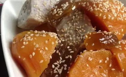 糕烧番薯芋是潮汕地区比较受欢迎的甜点小食,把番薯、芋头等材料切成块,放入糖浆中熬煮。香甜而韧性,不容易腻。