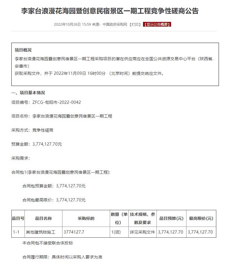 就在2022年10月,旬阳市城关镇人民政府发布了《李家台浪漫花海园暨创意民宿景区一期工程竞争性磋商公告》中标公告,中标金额为377.15万元。前脚招标后脚拆除的吊诡操作,引发舆论质疑自然在情理之中。