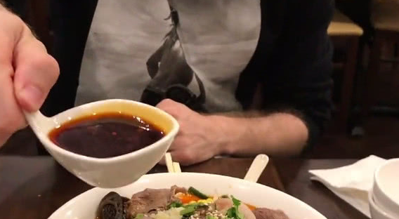 随后,服务员就将这牛肉麻辣烫送到餐桌上面,这位外国吃货看到了之后一脸无奈,发现,牛肉麻辣烫一点都不正宗,跟在中国吃到的天壤之别呢。闻起来的时候一点香味都没有,尝了一口发现味道非常的难吃,最后,跟服务员要了一点辣椒,才勉强吃的下去,吃完要结账的时候,发现这一碗12.95美元感觉被坑。小吃货们,你们觉得呢。