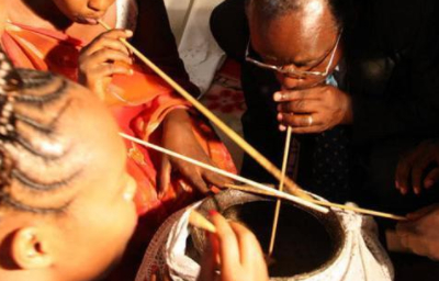 酿好的一大群人围坐在一起来品尝,他们喝酒就是用这种长长的管子吸着喝……这种酿出来的酒,5元一杯,随便喝,看着是不是很是过瘾呢?