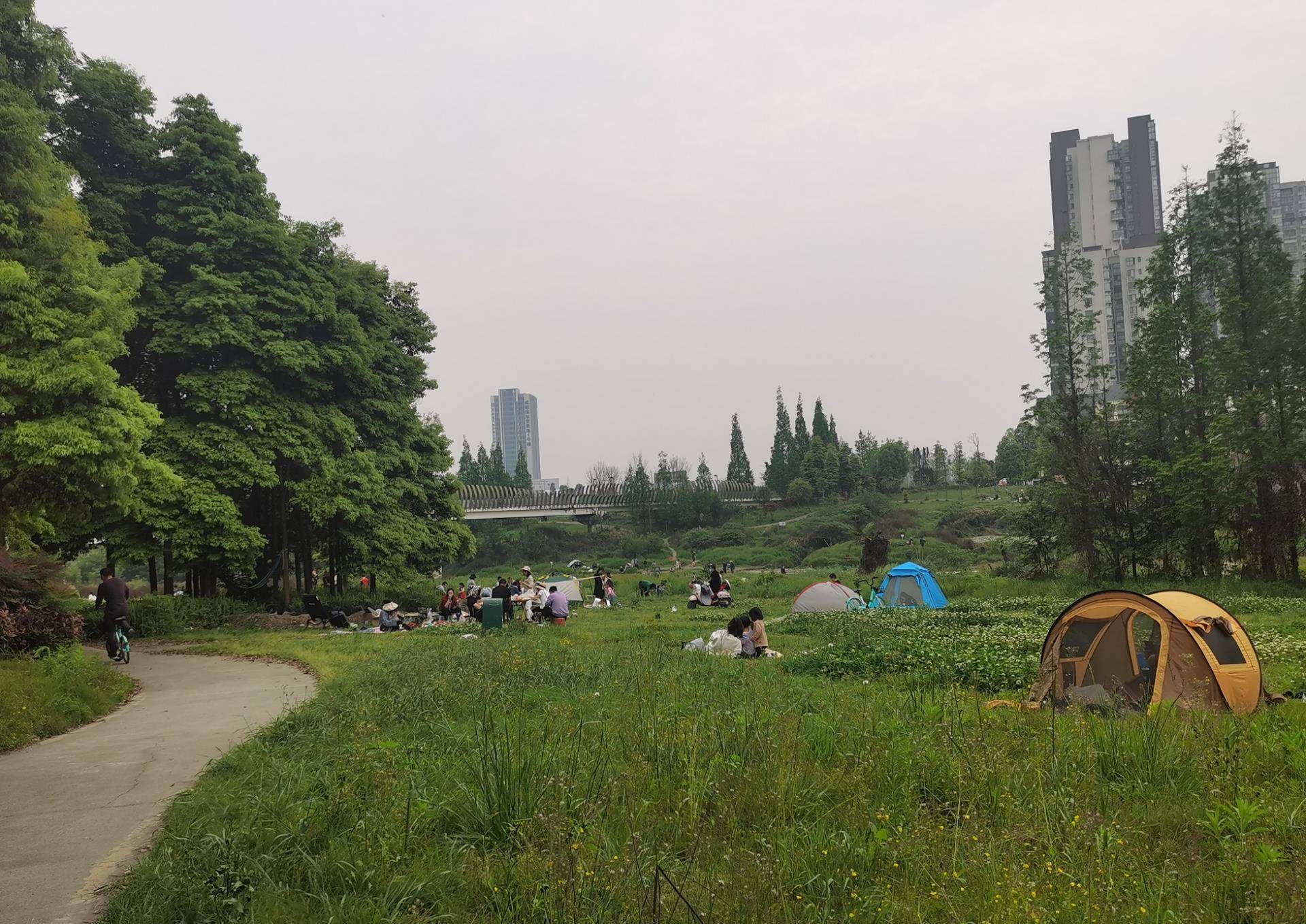 此外,不少人在公园里烧烤、露营。大家找一块空地,在河边搭帐篷,烧烤打麻将,或者住在森林里晒太阳。