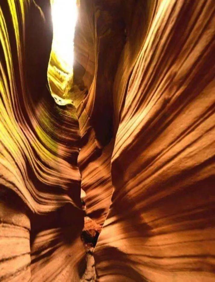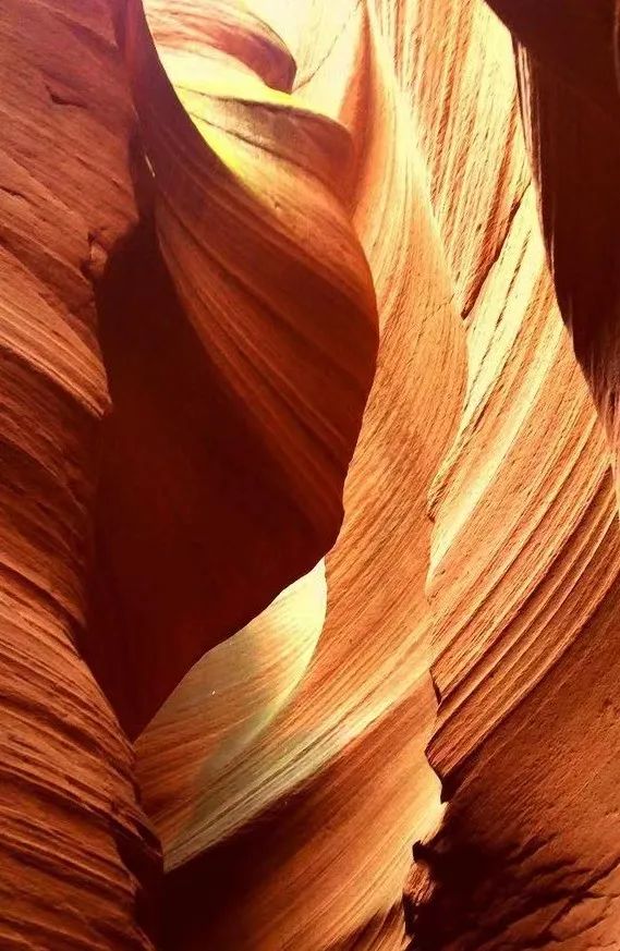 顺着岩壁,从纵向的旋转中下来,你将进入横向的水波纹流线的世界。冥冥之中,你仿佛潜在海洋中,抚摸着岩壁的水波纹,如鱼自由自在地游弋。在畅游的乐园,那么光滑,那么细腻,没有阻挡,没有牵挂。游着游着,你好像又驾着一叶扁舟,在峡谷中漂移,漂移出“林下猿垂窥涤砚,岩前鹿卧看收帆”的怡然自得的心境。