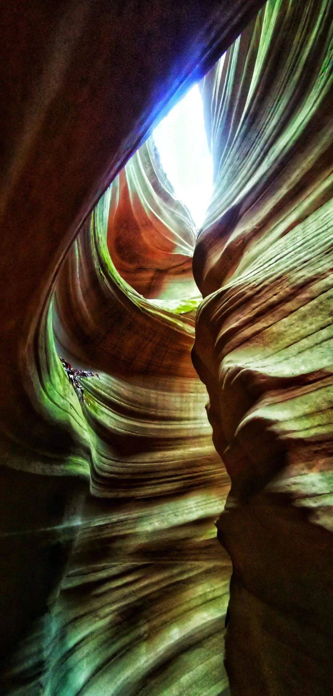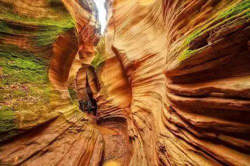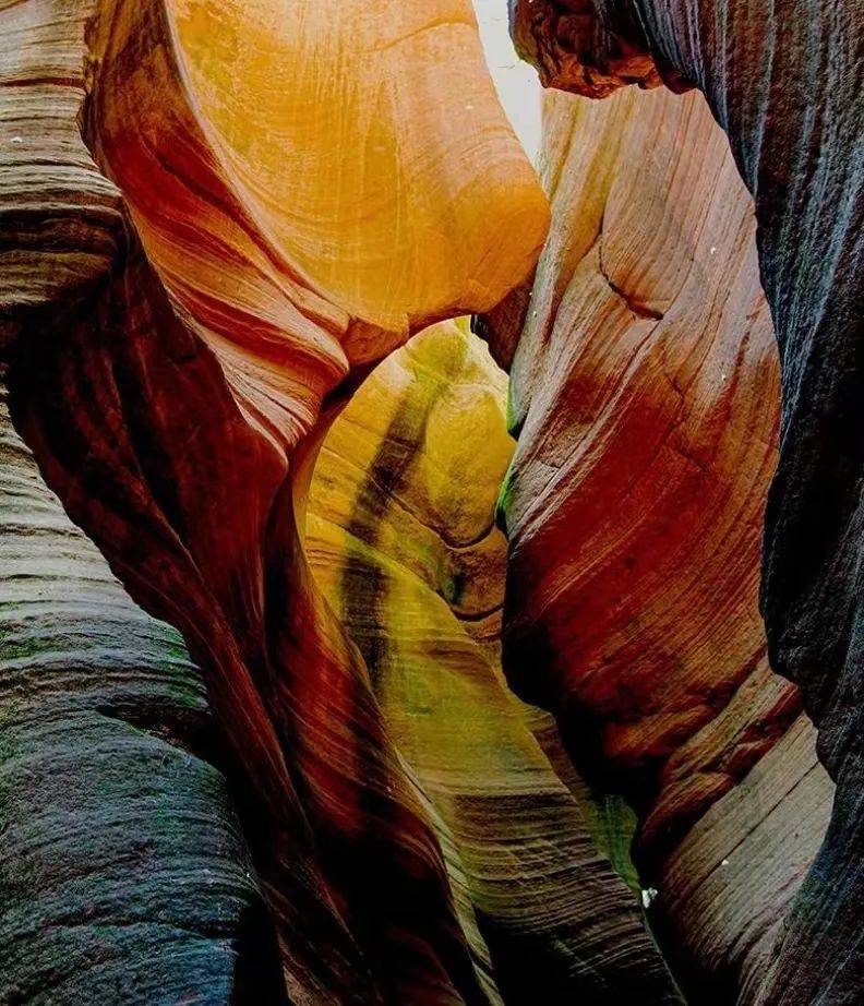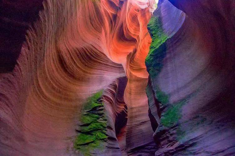 在这峡谷的“动感地带”,光的艺术岂能缺席。尤其是中午太阳光射进峡谷内,光影交织,如梦如幻。红色的岩石、绿色的苔藓、黑色的腐殖质流痕、白色和黄色的泥膜,加上不同时间不同季节阳光照射的色彩变幻,构成了美伦美奂的梦幻世界。有人说,这里是地球上最接近梦境的地方,不点不假。置身斑斓中,你分不清时间,弄不懂方位,恍入仙境飘飘欲仙。
