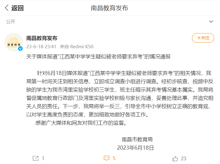 当晚,南昌教育局发布情况通报称,经初步核查,视频中反映的学生为湾里实验学校初三学生,班主任暗示其弃考情况属实。后续将妥善处理此事,并追究相关人员的责任。