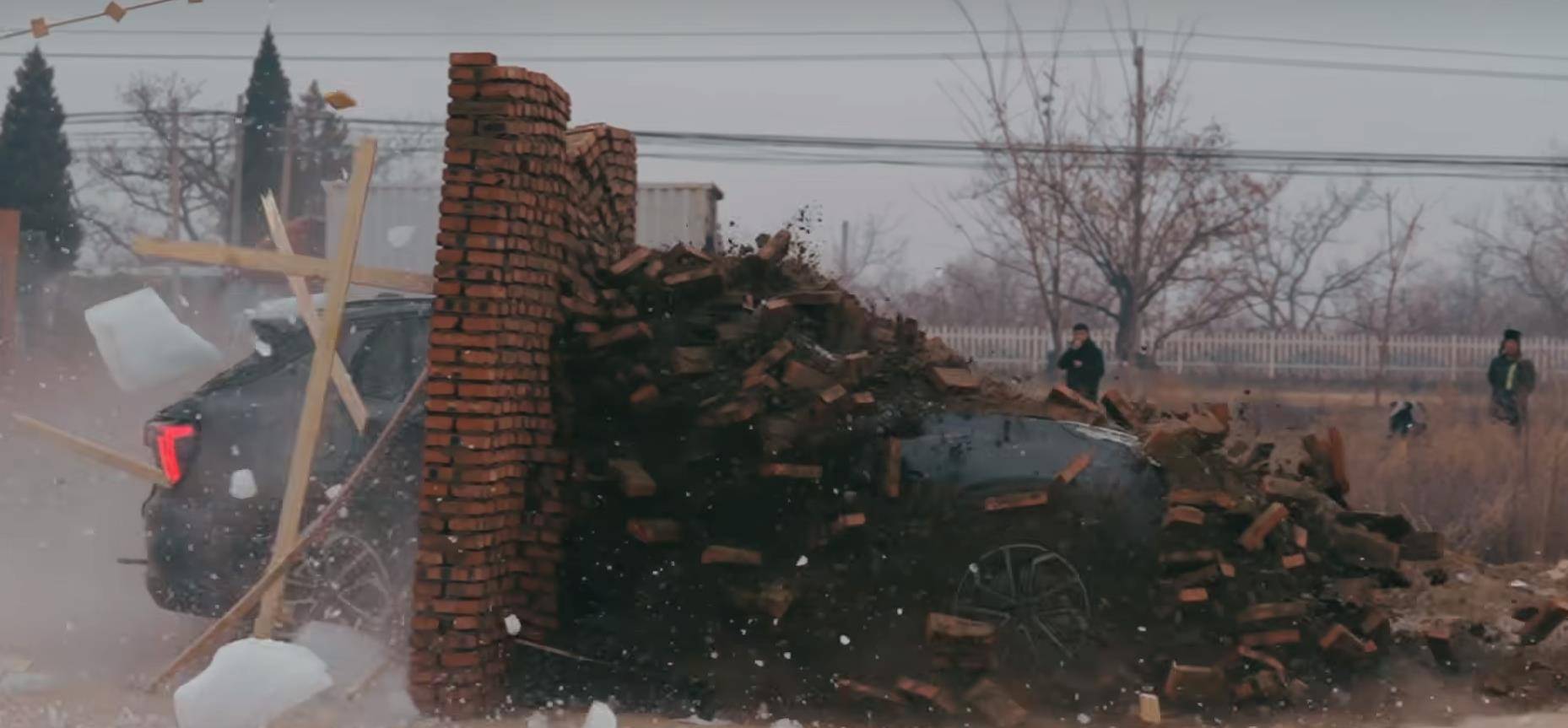然后这款车又遭受的撞墙的“虐待”,连续穿过了五层钢化玻璃和2厘米厚度三层强化石膏板和150mm厚度实木墙和150mm厚度冰砖墙以及240mm厚度的砖墙,很显然轻松通过。经过这道考验之后,领克01 EM-P的前防撞梁竟然没有变形,吸能盒也没有变形,车辆依旧能够启动并开走。