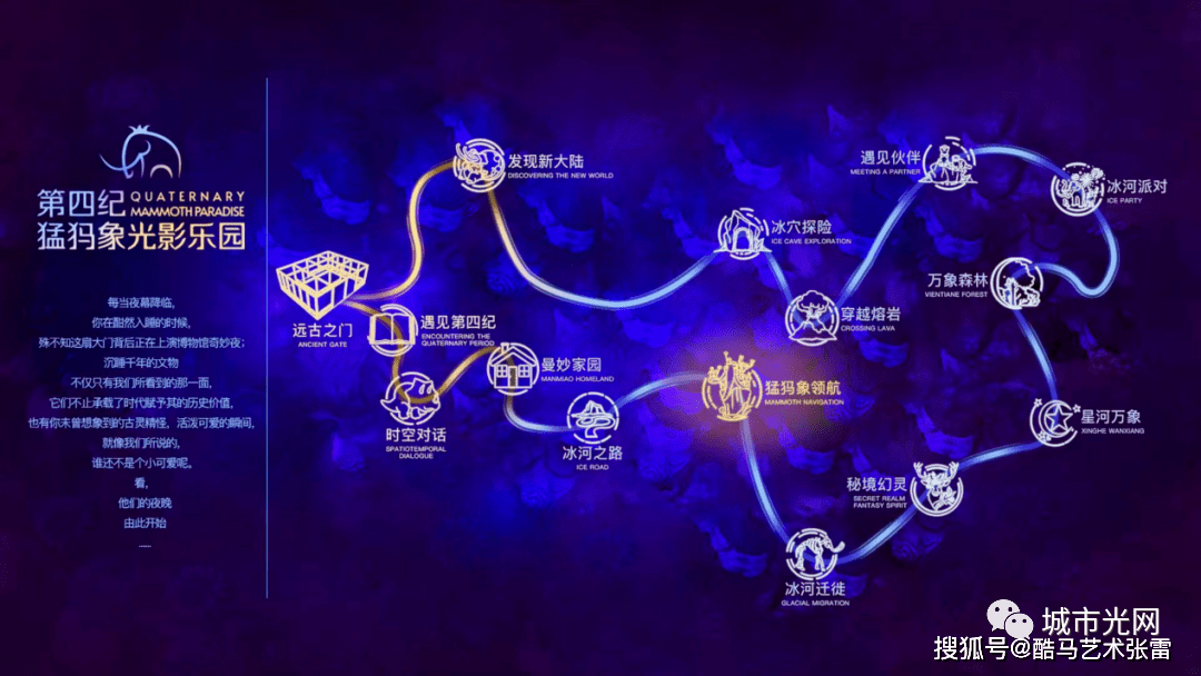 乐园主要以展现第四纪冰河时期猛犸象文化为轴心,通过巨型彩灯装置、多媒体光影、AR交互、灯光演绎,还原猛犸象、披毛犀、东北野牛、大角鹿等史前巨兽,在百花园生态丛林中,以光为媒,唱响一支回荡百万年的冰河赞歌。