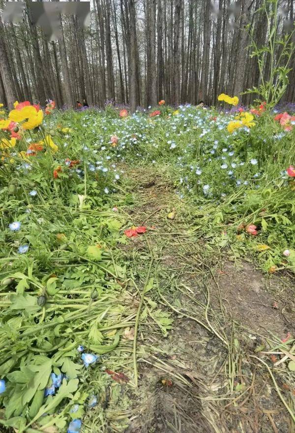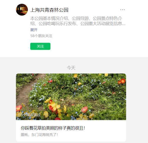 4月3日,上海共青森林公园发布消息称“东门花海斑秃了”,“你踩着花草拍美照的样子真的很丑!”