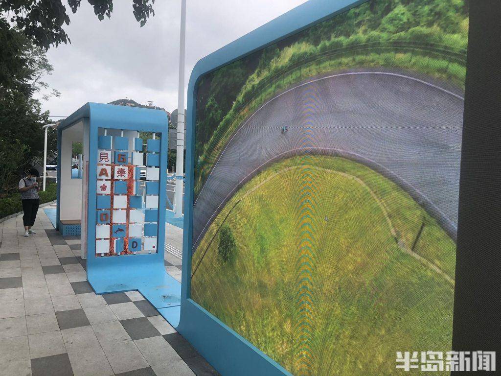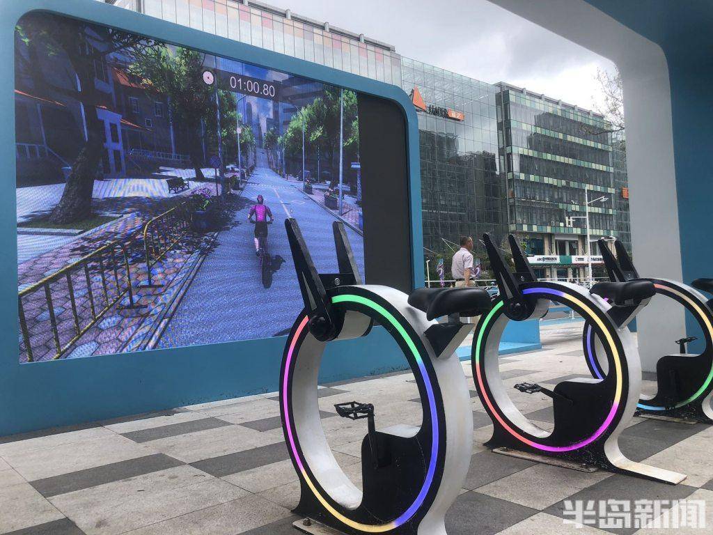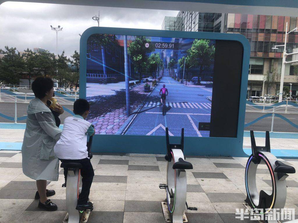 6月26日,崂山区秦岭路一公交车站附近,小孩子玩着模拟自行车竞赛,并通过大屏幕观看城市的3D街景。