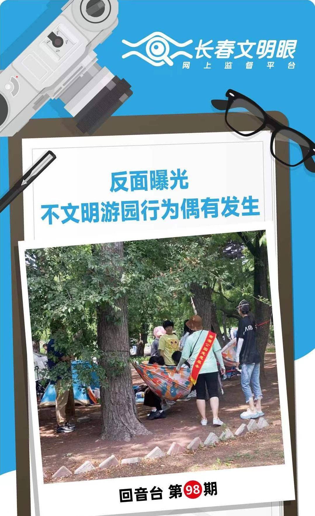 虽然大多数游客都能做到文明游园,但是在公园内还是有一些不文明现象。记者注意到,不少市民在端午节假期全家出游,去公园里“避暑”,在园区内寻找一处阴凉搭上帐篷,好不惬意。在南湖公园,很多地方都能看见帐篷的身影。记者了解到,为满足游客的需求,南湖公园开设3处帐篷租赁游玩区域,分别位于金沙滩、小西湖、二船台对面草坪小广场,同时开设14处绿地及林下共享空间,可供市民游客自行搭建帐篷、运动健身及休闲游憩,位置分布于小西湖两侧、湖心岛、白桦林等市民游客集中区域。但记者发现,在绿地上,还是有游客私自搭建帐篷、挂吊床。