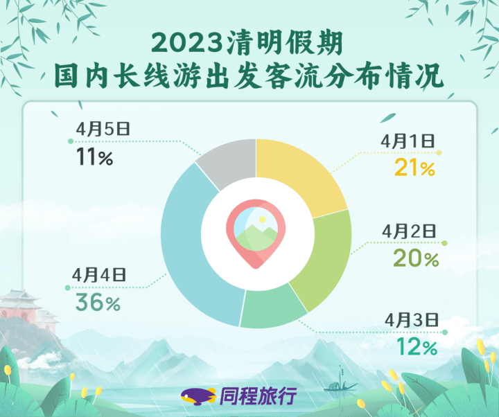 尽管清明只有1天假期,但“拼假族”们依然选择利用年假在清明假期前后来一次长途旅行。来自同程旅行平台度假线路搜索及咨询预订数据显示,清明假期前后国内长线游与出境游需求旺盛,表现出良好的复苏势头。其中,国内游热门目的地主要有云南、广西、贵州、四川、海南、湖南、北京、陕西、河南、广东等。国内长线跟团游出游天数一般在4至6天之间,以4月4日出发的线路客流量相对较大,占比36%。