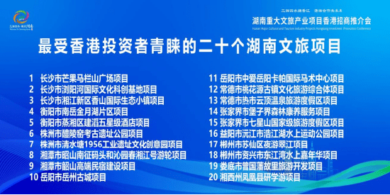 此次招商活动中,湖南省共推出363个文旅招商项目,总投资3388亿元,投融资需求2464亿元。衡阳、株洲、常德三市还重点推介了83个项目,总投资额1234亿元。会上,由香港企业代表和湖南文旅企业代表联合发起成立了“港湘招商合作联盟”,发布了最受香港投资者青睐的20个湖南文旅产业项目。成立仪式上,杨宏伟上台一起启动和见证。