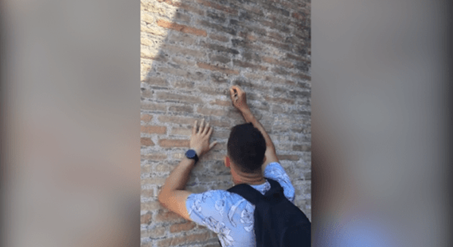 据英国《都市报》报道,一名游客被拍到用钥匙在罗马斗兽场的古城墙上刻了字。一段发布在Reddit上的视频显示,这名男子穿着短裤和t恤,背着背包,正在用钥匙在这栋具有1937年历史的古城墙上刻着“Hayley”的字样。在另一名游客将相机镜头对准这名男子时,他还看着镜头咧嘴笑了笑,然后继续用钥匙在墙上刻女朋友的名字。网友们迅速对这名男子发起了抨击,并呼吁视频拍摄人员将视频发给警方,让警方逮捕他。如果他被警方逮捕了,将面临巨额罚款,而在过去,这一罚款高达1.6万英镑。他还可能面临长达一年的监禁。