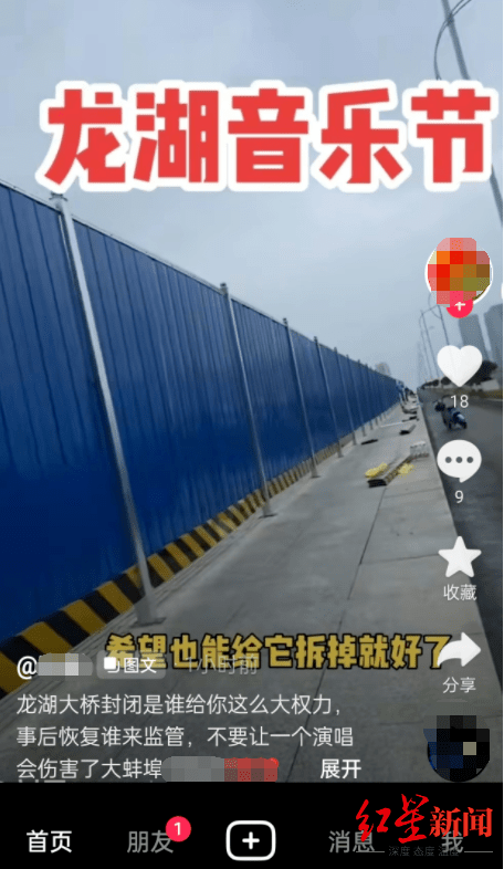 6月26日,据多名安徽网友反映,“安徽蚌埠龙湖大桥被建铁皮围挡,地上打了很多眼,还占用了盲道”,疑似是因为当地月底临近的音乐节。