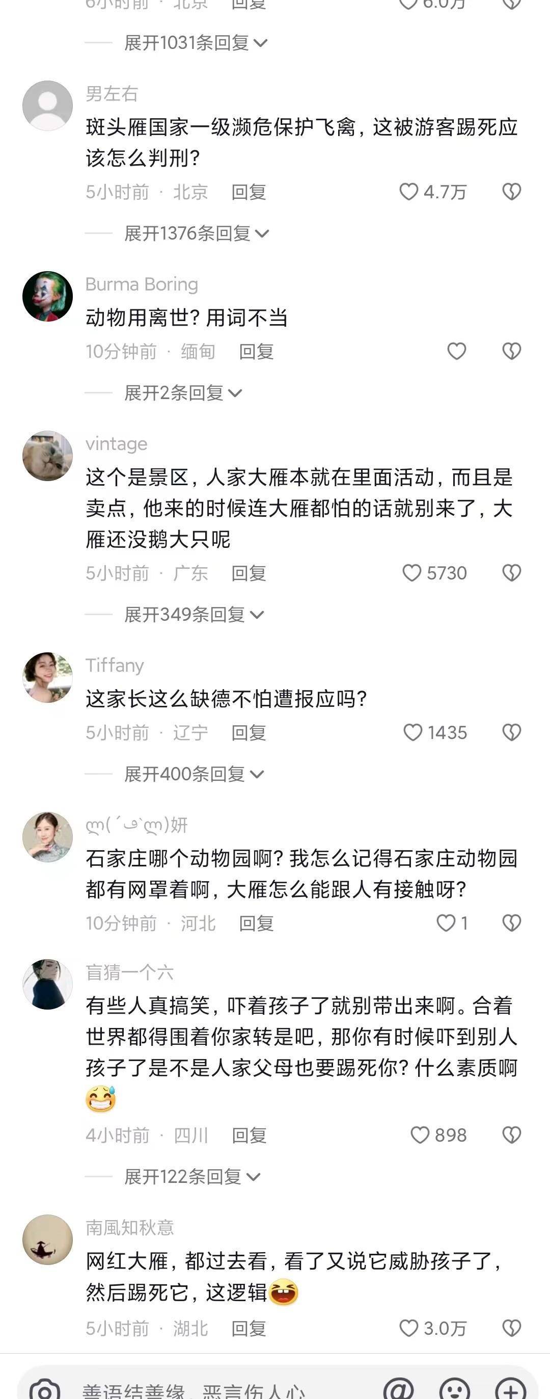 对于这起事件,网友们的观点各不相同。一些人表示,大雁的体型相对较小,应该不会对孩子造成严重伤害,而且孩子可以躲开,踢击大雁的行为并不可原谅。他们认为,这只是一个借口,实际上是出于恶意。还有人指出,大雁作为国家二级保护动物,故意伤害致死将构成犯罪行为,应该受到法律的制裁。